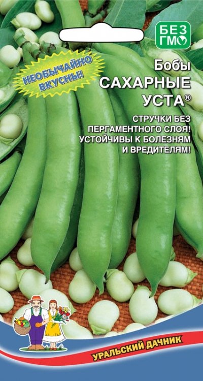 Среднеспелый сорт. Бобы длинные, до 15 см, широкие, зеленые, с толстыми мясистыми створками. Семена крупные, овальные, сплюснутые, белые.